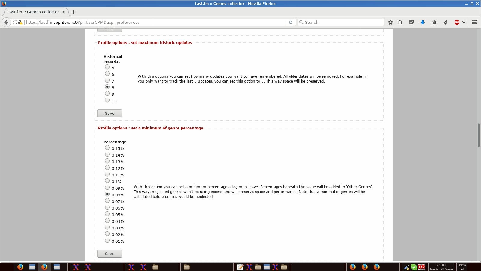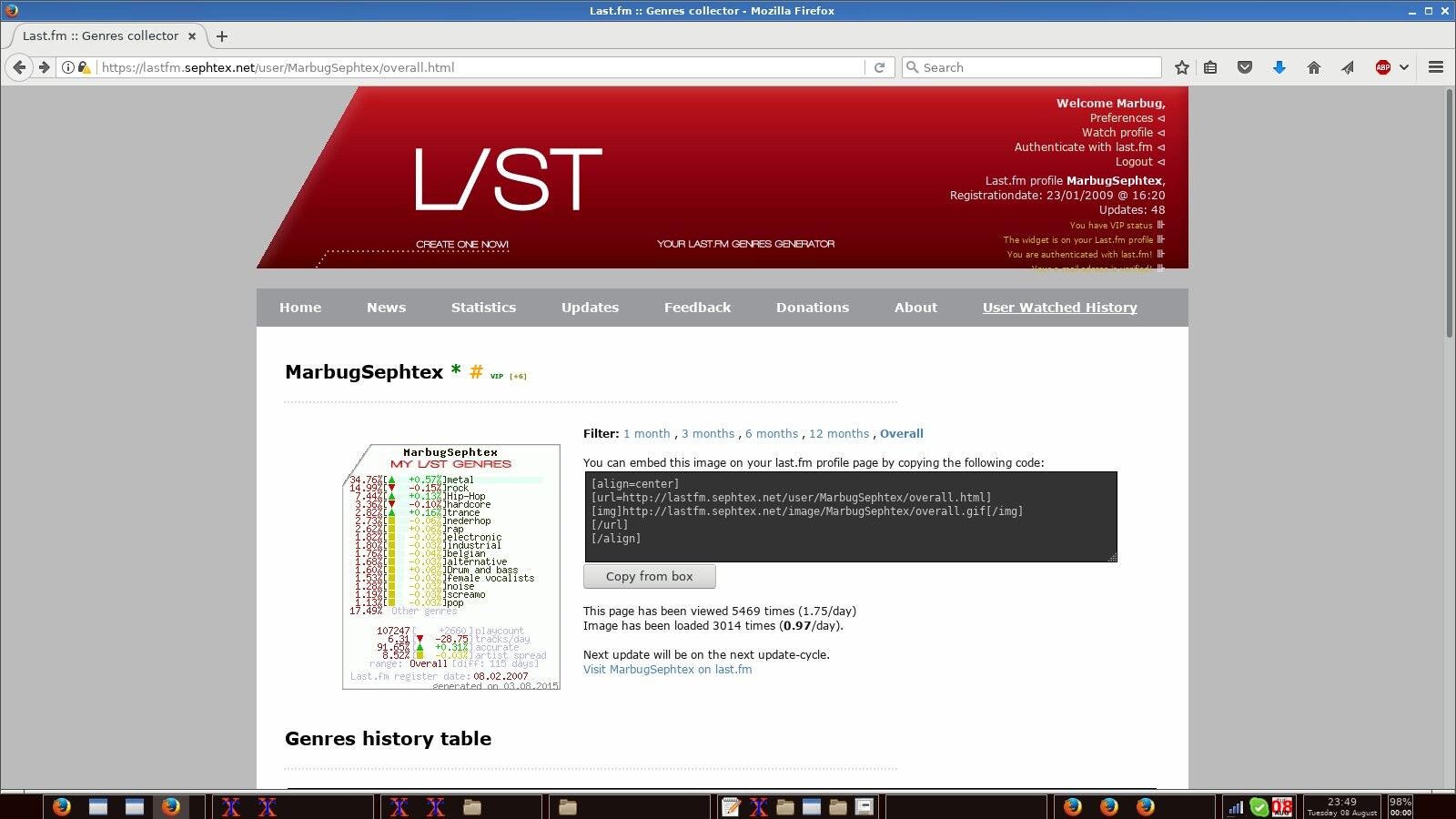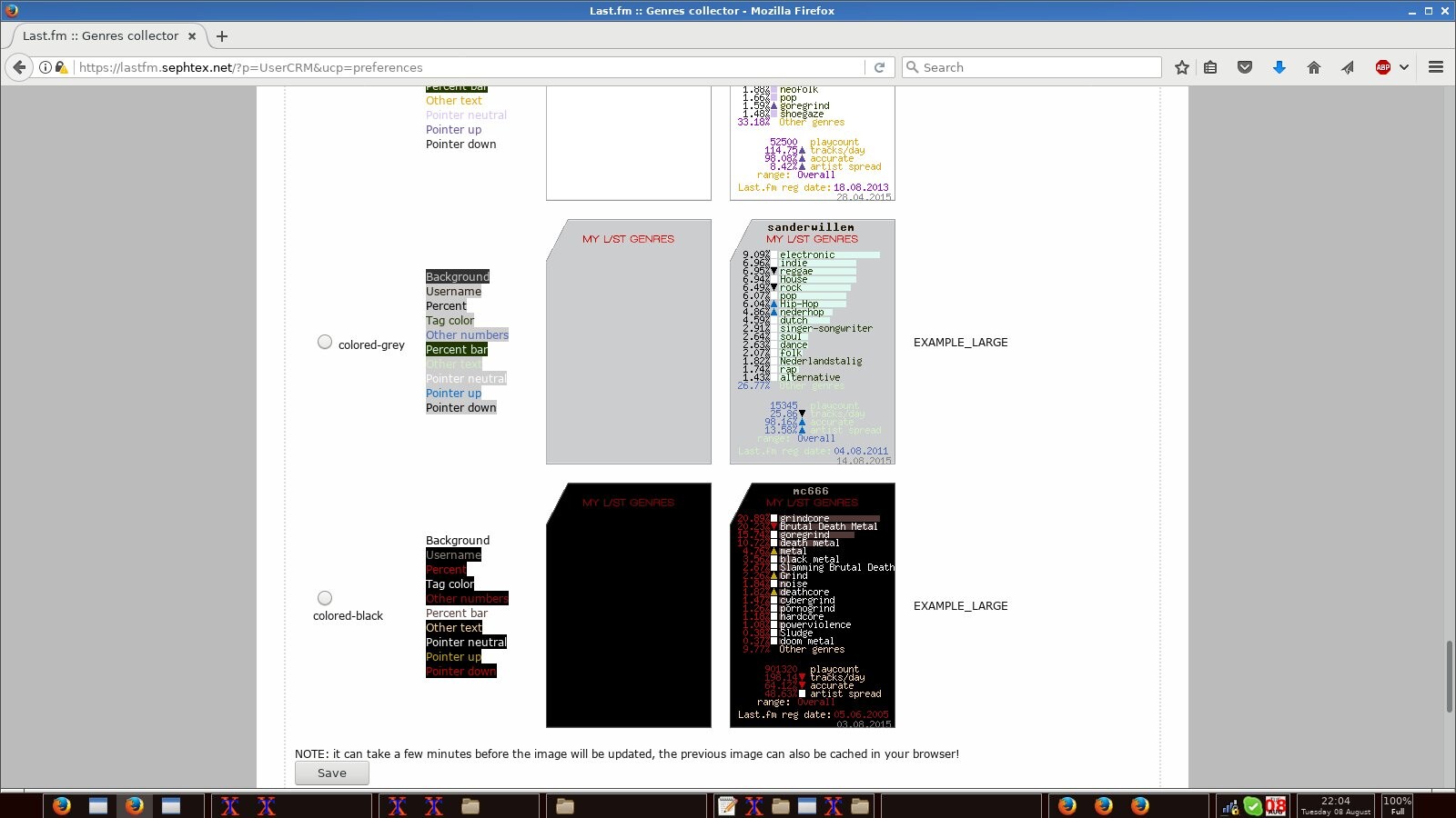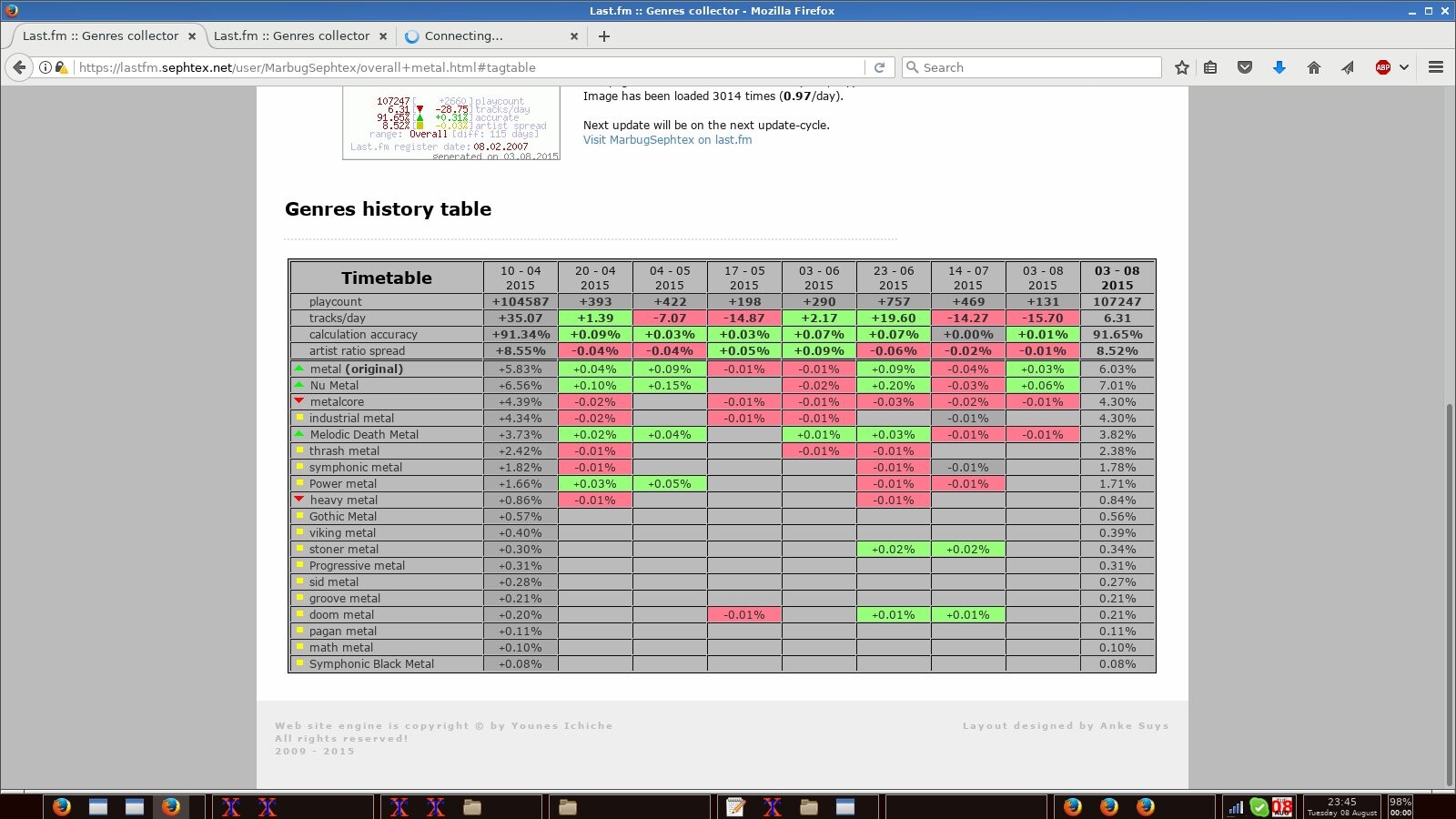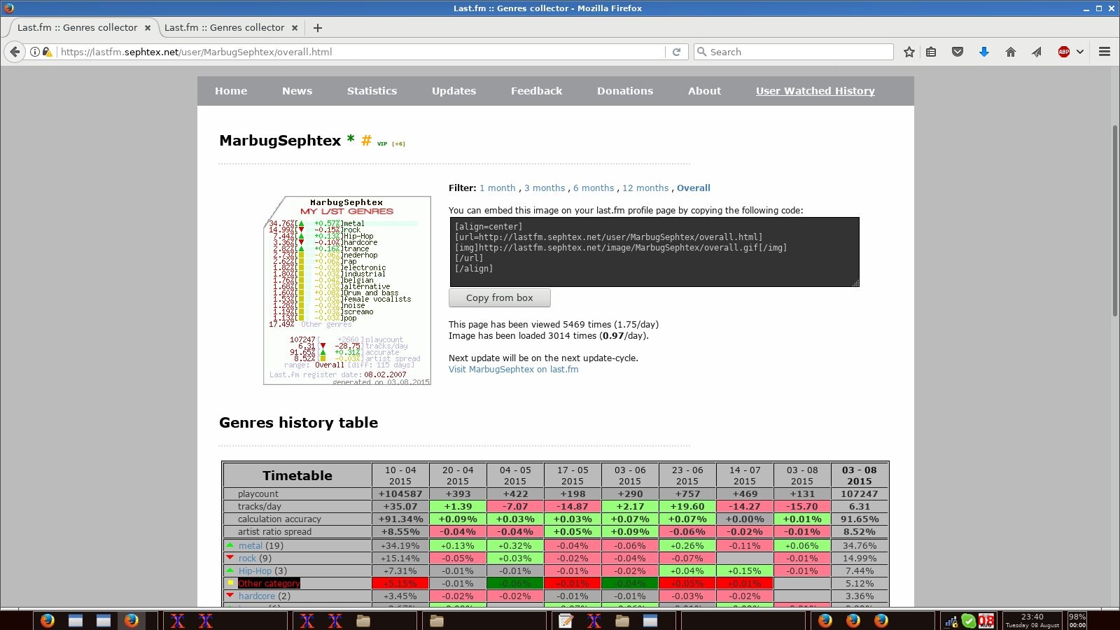 This project fetches data from your last.fm account and creates a gif that you can place on the sidebar of your last.fm profile as it'll show a summary of genres you listen to. This will be generated from data retrieved periodically from your last.fm profile. Up to 10 samples of history will be shown in a table on your profile on the website, with the change in percentage compared to the last calculation.
