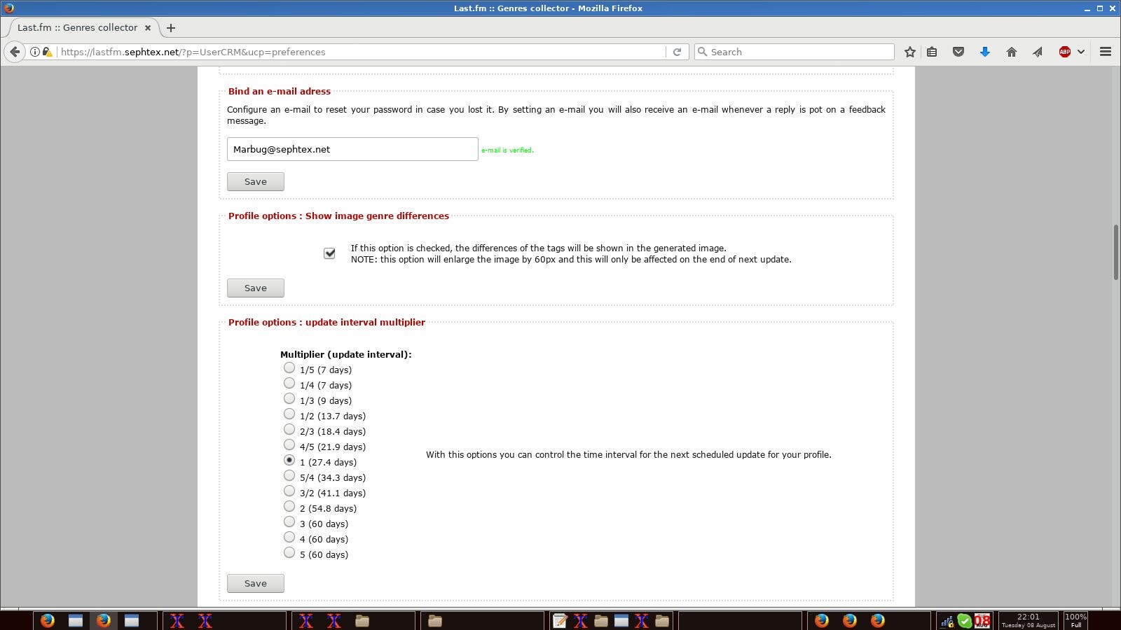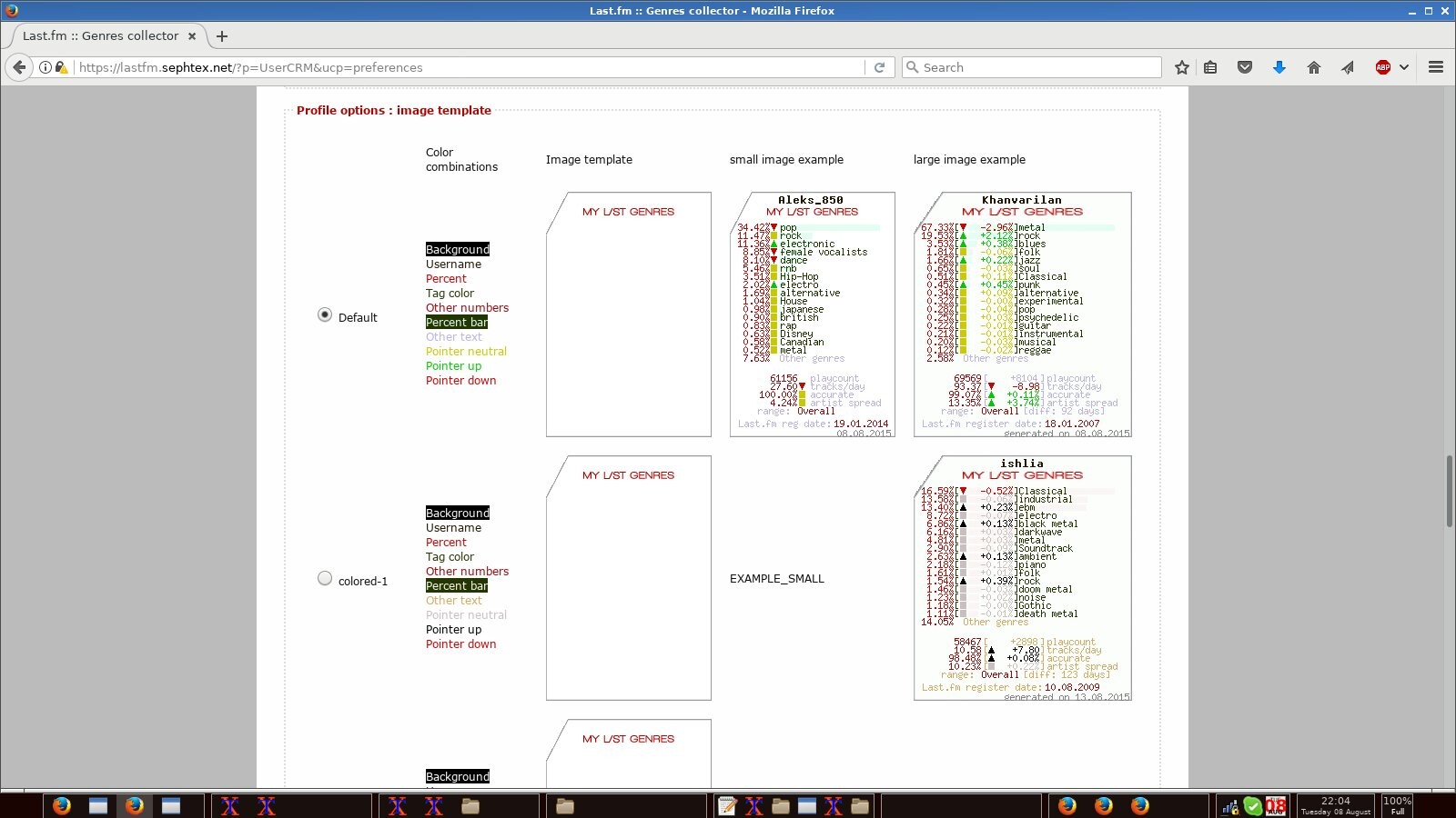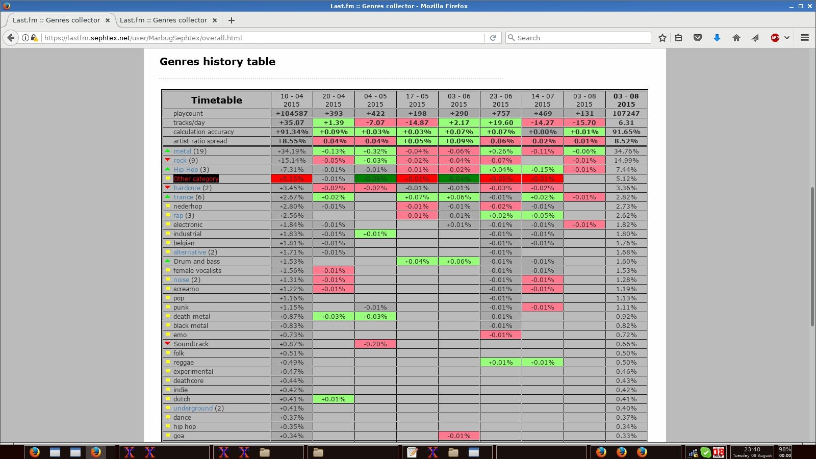 This project fetches data from your last.fm account and creates a gif that you can place on the sidebar of your last.fm profile as it'll show a summary of genres you listen to. This will be generated from data retrieved periodically from your last.fm profile. Up to 10 samples of history will be shown in a table on your profile on the website, with the change in percentage compared to the last calculation.